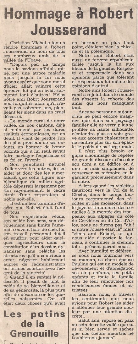 Christian Michel (de Saint-Vincent les Forts) lui avait rendu un bel hommage dans le journal à son décès.